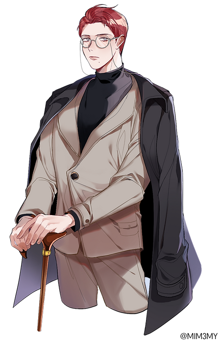 짧게 잘라 넘긴 붉은 머리카락에 무심한 백색 눈동자. 알이 큰 안경을 쓰고 있다.